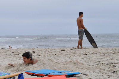 this kid was especially enjoying his time at the beach - clearly trying to keep warm in the sand.